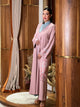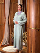 Djellabah vert amande brodée de motifs zigzag en bicolore, alliant sobriété et élégance. Elle révèle un caftan travaillé en randa avec col officier, dans une harmonie tout en douceur.