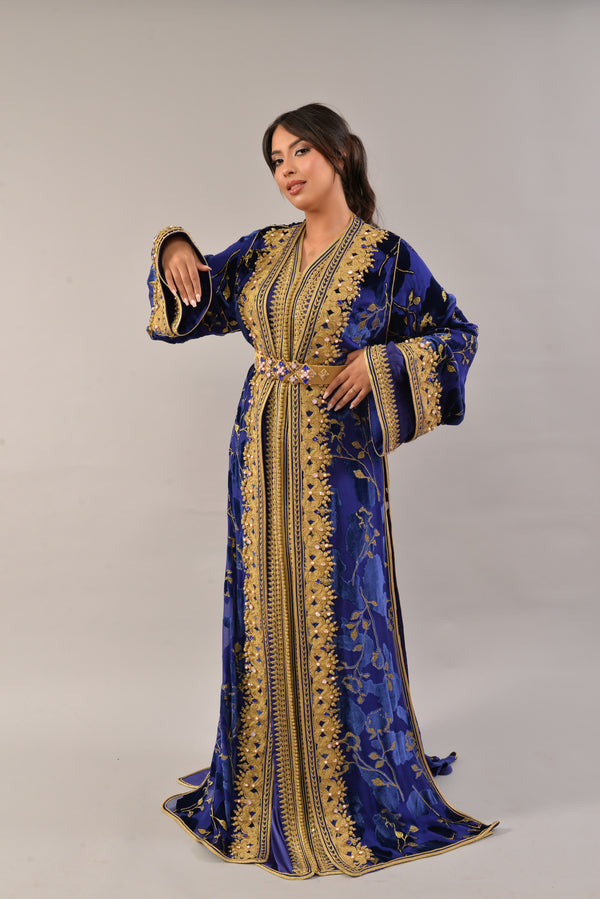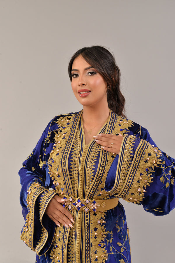 Réalisé dans un somptueux velours Tlija dévoré, ce caftan incarne la richesse du patrimoine marocain. Le travail doré Maâllam et le perlage Swarovski en font une pièce impériale à l’aura majestueuse.
