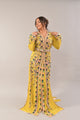 Ce caftan en drap de soie parme évoque la délicatesse. Brodé à la main en fil d’or avec des perles Swarovski, il séduit par sa légèreté, sa fluidité et sa grâce intemporelle.