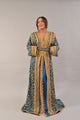 Un jeu de lumière et de matière pour cette création unique en organza de soie noir, argent et doré. Son sous-caftan en lamé de soie et le travail pailleté noir Zwa9 Maâllam capturent l’élégance contemporaine.