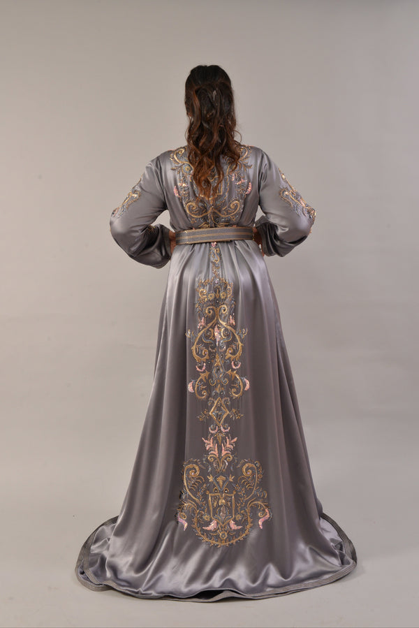 Cette pièce unique, réalisée en drap de soie, incarne l’essence même du raffinement marocain. La broderie Rbati à la main en fil d’or et les perles Swarovski délicatement apposées créent une harmonie visuelle délicieuse.