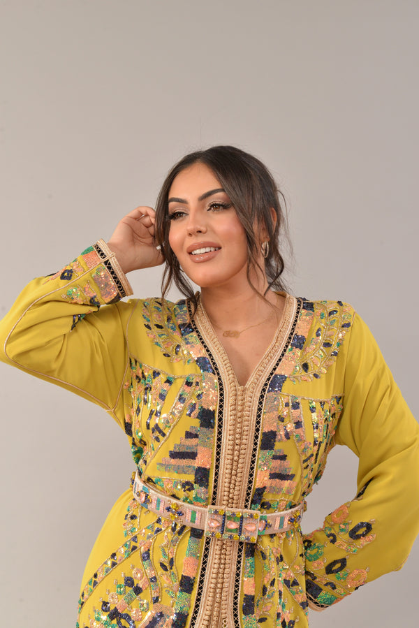 Un caftan solaire et audacieux en crêpe de soie jaune, entièrement travaillé à la main avec des sequins haut de gamme et des perles Swarovski. Parfait pour illuminer les grandes célébrations avec style et fraîcheur.