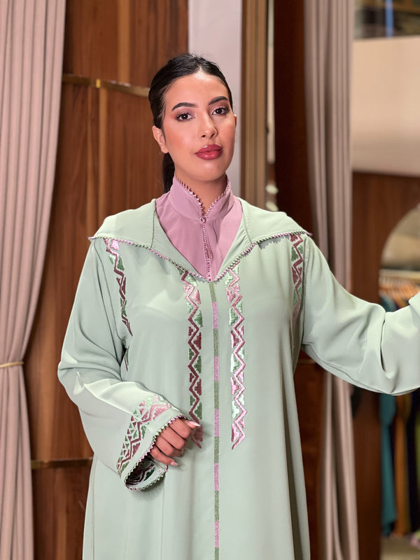 Djellabah vert amande brodée de motifs zigzag en bicolore, alliant sobriété et élégance. Elle révèle un caftan travaillé en randa avec col officier, dans une harmonie tout en douceur.