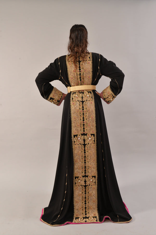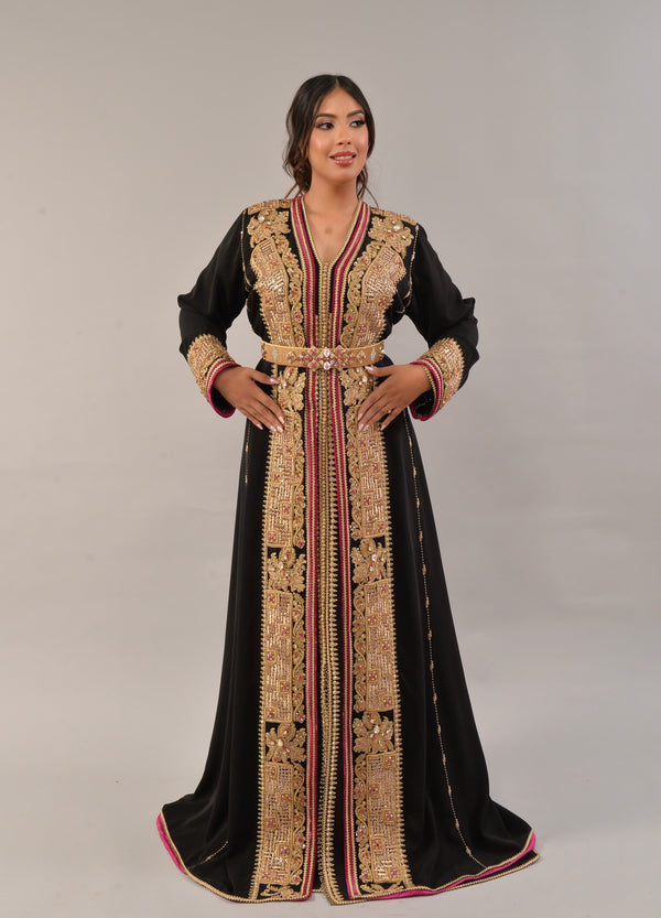 Pièce de caractère, ce caftan noir en crêpe de soie est rehaussé d’un Zwa9 Maâllam sophistiqué et d’un perlage Swarovski discret. La doublure fuchsia apporte une modernité éclatante à ce classique revisité.