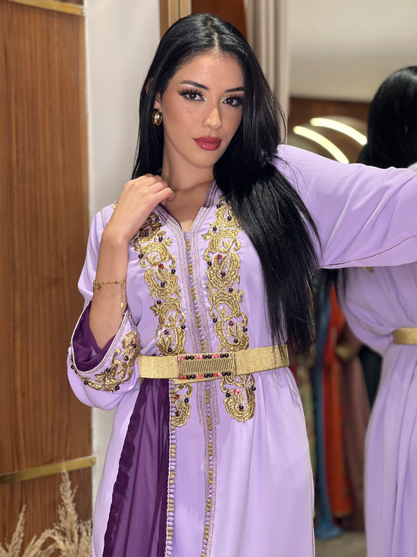 Un caftan fluide dans une teinte lilas délicate, sublimé par une touche de satin prune dévoilée à travers une fente élégante. La broderie dorée faite main se déploie le long du buste et des manches, apportant éclat et raffinement à cette pièce à la coupe moderne. Une ceinture en or clair souligne délicatement la taille.