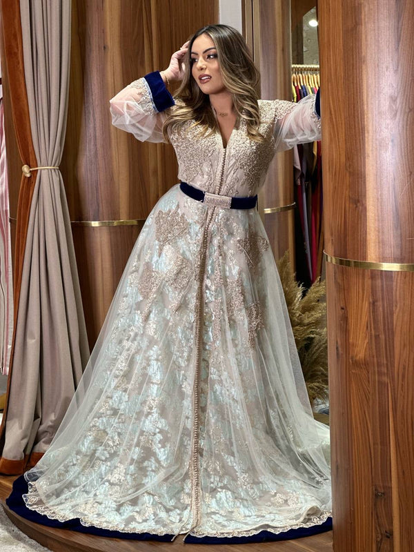 Cette pièce d’exception mêle la légèreté de l’organza au faste du tissage métallique. Un jeu de transparence délicat contraste avec une base satinée aux reflets irisés, tandis qu’une ceinture en velours bleu nuit vient souligner la taille avec majesté. Idéal pour une mariée ou une grande occasion.