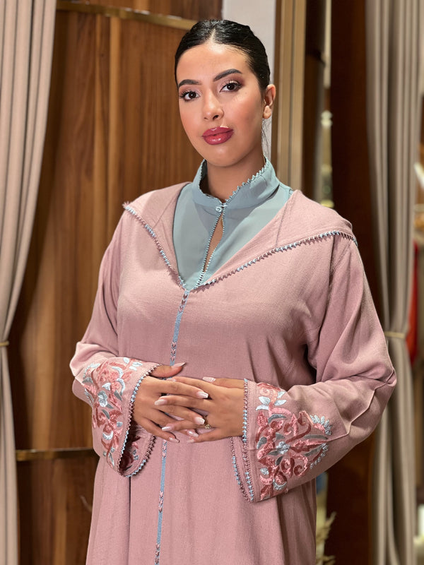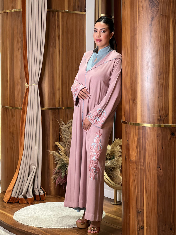 Un charme intemporel pour cette djellabah vieux rose aux broderies florales délicates. Le caftan bleu ciel travaillé en randa vient adoucir la silhouette avec romantisme et raffinement.